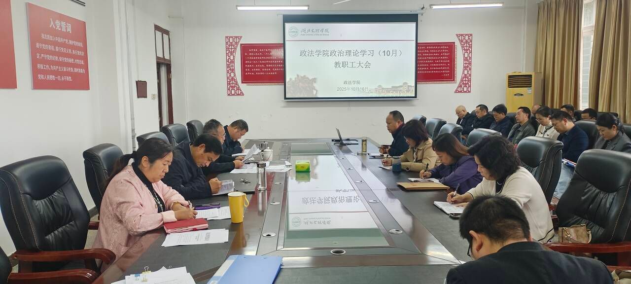 (政法学院 通讯员 周敏)10月16日下午,政法学院在S11一楼会议室召开10月份政治理论学习和教职工大会。政法学院党委书记马永军、院长聂军、副院长王正宇、副院长袁岳霞及全体教职工参加会议。会议由学院党委书记马永军主持。