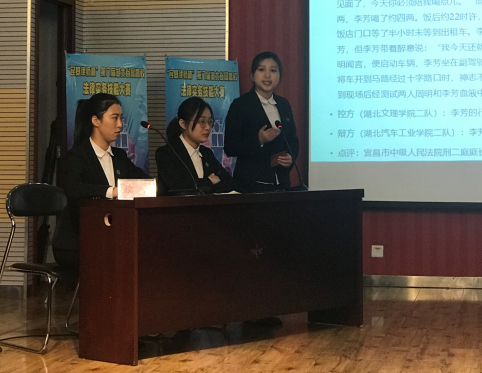 我校首战参赛队伍是由区沛、张漫婷、甄奕菲三位选手组成的湖北文理学院第二代表队,对战湖北汽车工业学院第二代表队。双方就行为人的行为是构成交通肇事罪还是不构成犯罪,展开了激烈的辩论,控方湖北文理学院二队先发制人,就行为人主观上是教唆还是撒娇,客观上并不是车辆的驾驶者,最后运用举轻以明重的原则对司法解释进行扩张解释,指控行为人构成交通肇事罪,辩方湖北汽车工业学院第二代表队认为行为人的行为不构成犯罪。比赛氛围十分紧张激烈,是双方辩手才华与智慧的碰撞。