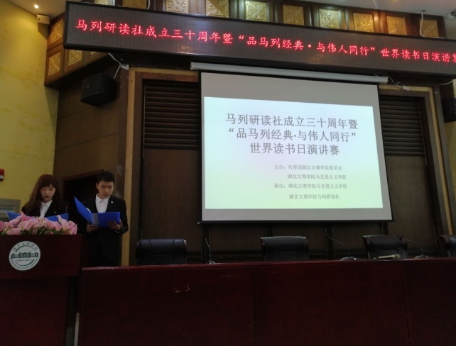 (马克思主义学院 通讯员 付晓妍)为纪念马列研读社成立三十周年,重温马列经典著作,响应世界读书日,马克思主义学院联合校团委举办“马列研读社成立三十周年暨‘品马列经典·与伟人同行’世界读书日”为主题的演讲比赛(复赛)于4月9日晚在行政楼举行,马克思主学院周贵华等7位专业教师担任评委。