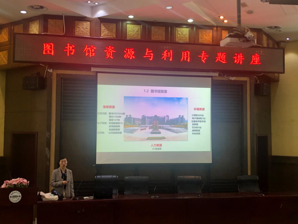 李桂群首先向同学们介绍了图书馆概貌,包括图书馆的外部风貌、内部构成、每个大区分块以及每一个小的书柜,方便同学们以后查询资料。随后介绍了手机APP掌上图书馆、纸质图书资源的使用、信息咨询与阅读推广服、图书借入借出程序以及图书馆的人力资源利用与数字资源利用。讲座期间,李桂群热情地为同学们答疑解惑,帮助同学们现场注册账户。