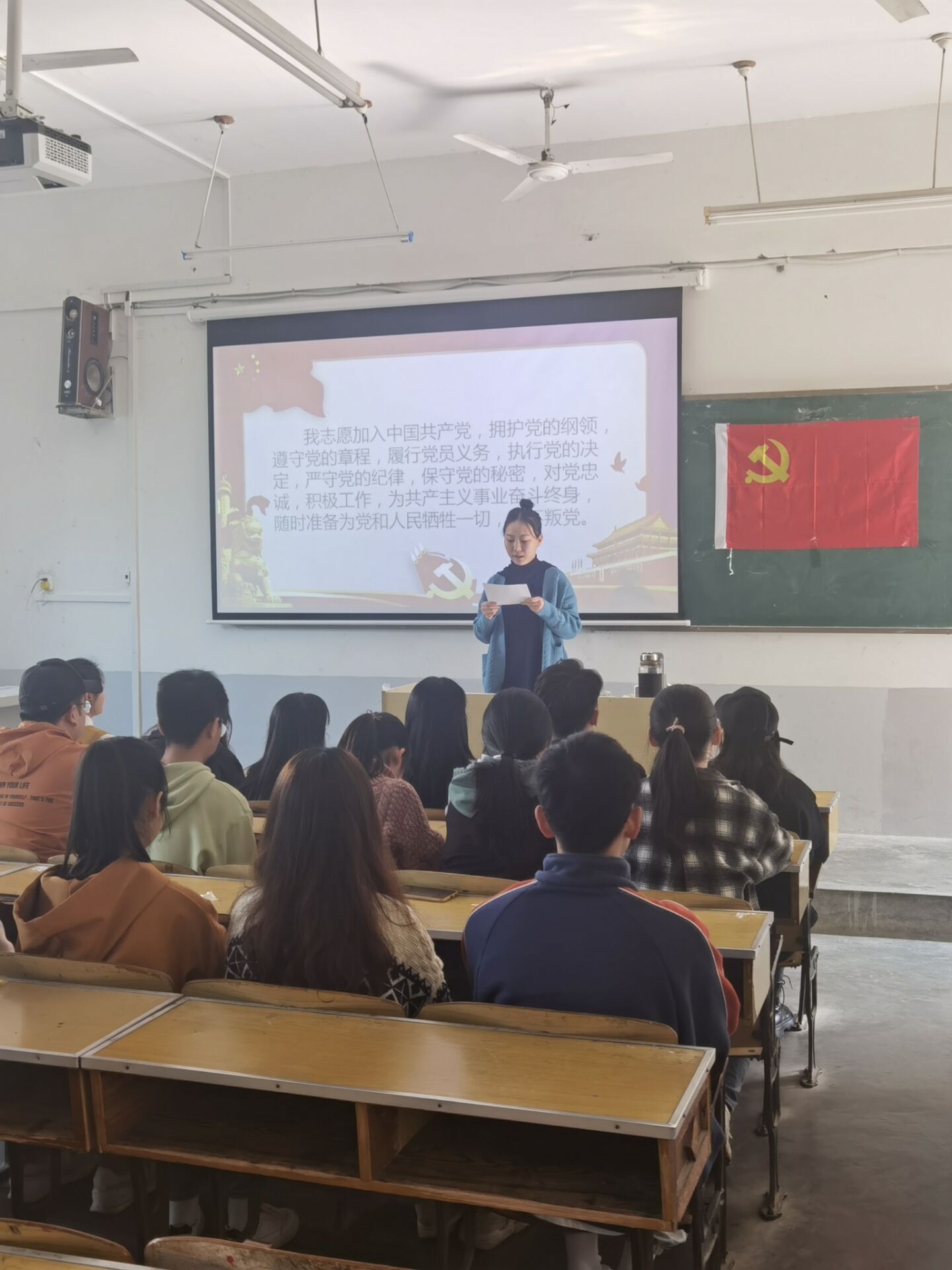 仪式共四项内容。活动宣布开始后,雄壮的国际歌奏响,全体党员起立,铿锵有力的歌声拉开活动的序幕。第二项,一起参加入党宣誓的预备党员的共19人,宣誓人持立正姿势,面向党旗,举右手握拳宣读誓词,由预备党员代表尹明慧领誓,坚定有力的宣誓环节彰显了各位预备党员积极向党组织靠拢的决心和信心。第三项由预备党员代表朱静雯同志发言,她向党组织对其的关心和指导表达了感谢,同时表明了加入中国共产党为党和国家现代化建设做贡献的坚定意志。接着由党员代表林梓滢同志发言,她激励各位预备党员努力提升自身素质全心全意为人民服务,表达了对各位预备党员正式加入党组织继续为人民服务的期盼。