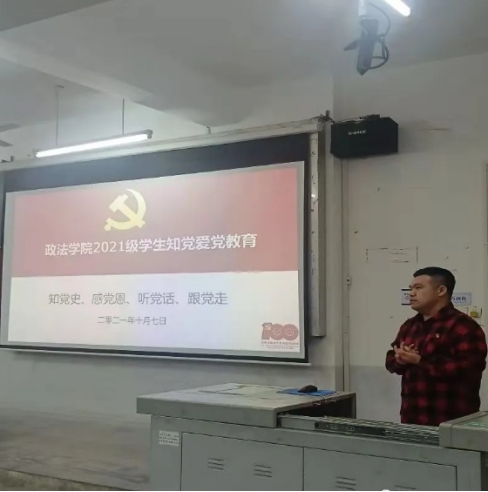 (通讯员 范冰琪)为深入学习贯彻习近平总书记“七一”重要讲话精神,加强新生对党组织的理解认识,教育引导新生学党史、悟思想,政法学院于10月7日晚上6点30分在北区六栋阶梯03教室开展“知党史,感党恩,听党话,跟党走”主题教育。活动由政法学院辅导员董凯老师主讲,2021级全体新生参与此次教育活动。