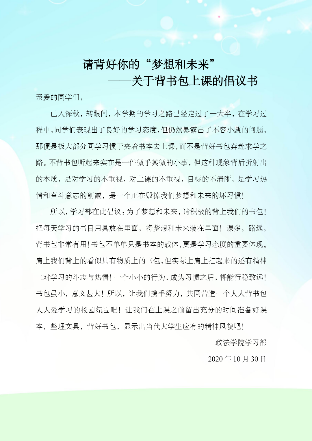 【学风建设】请背好你的“梦想和未来”——关于背书包上课的倡议书