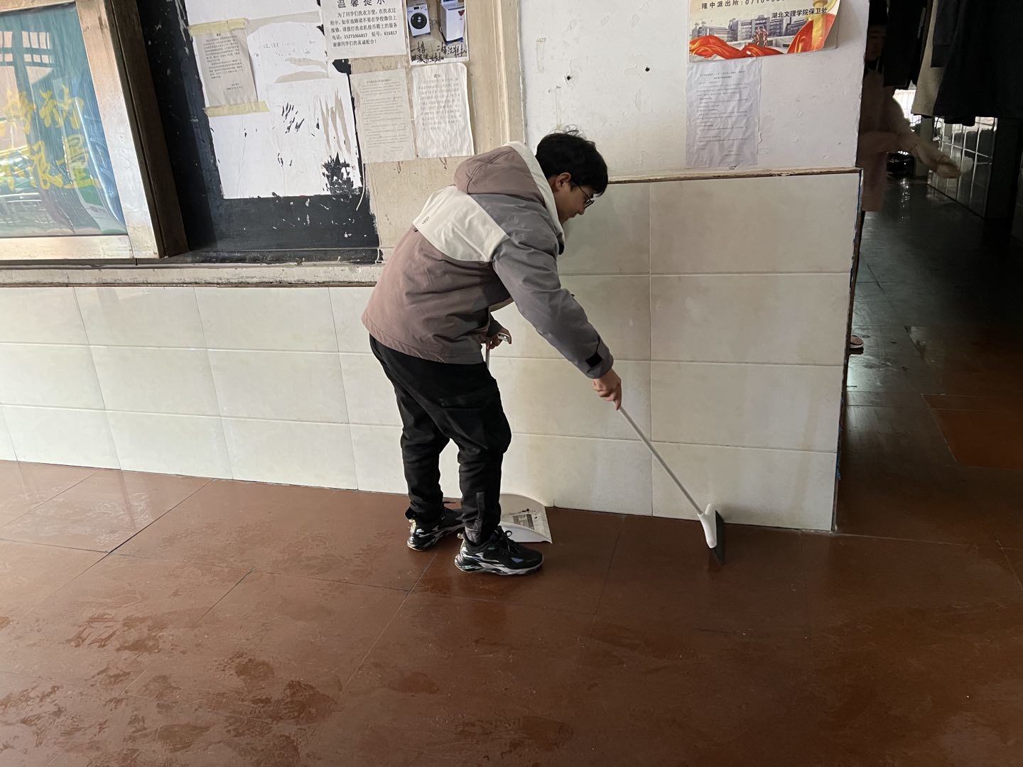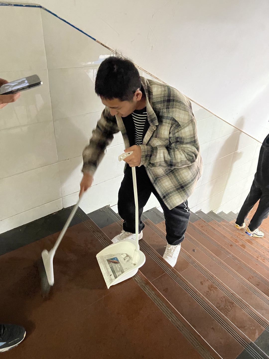 角色互换,体验后勤人员的一天,帮助们打扫寝室楼的卫生,主动承担了清扫任务。