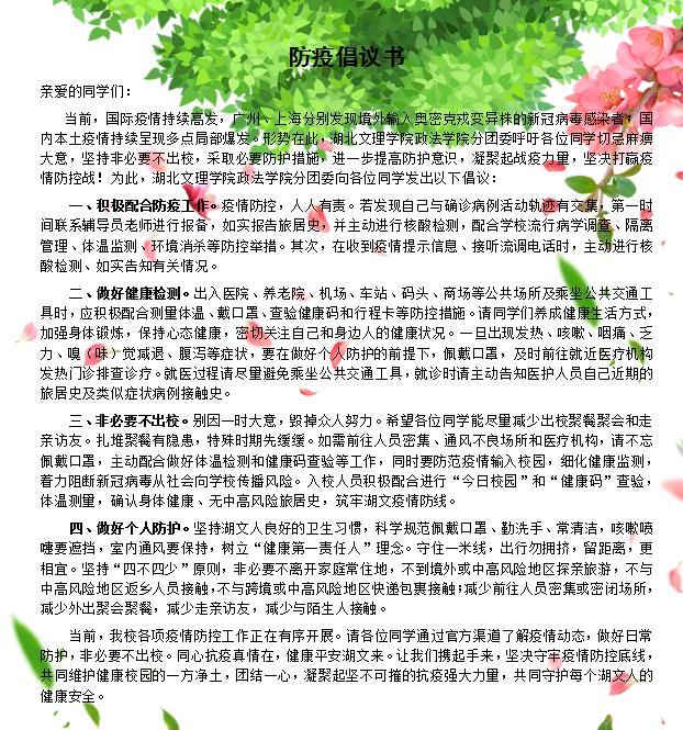 经过两天的宣传和筹备工作,活动吸引了学院包括研究生在内的大量青年学子参与,同学们围绕疫情防控、美丽校园建设、助力碳中和、节约粮食、光盘行动、志愿服务等新时代文明实践主题,进行了倡议内容的撰写、设计。针对同学们提交的倡议书作品,共评选出一等奖1名,二等奖3名,三等奖5名。