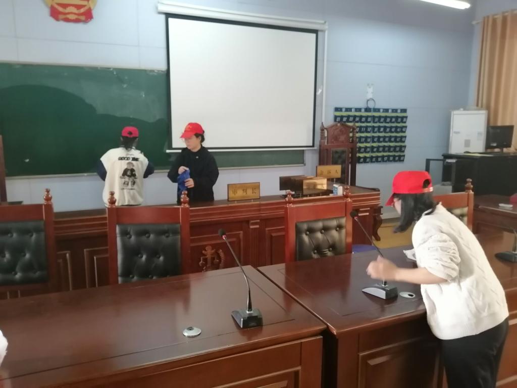 本次活动,志愿者们积极地打扫着模拟法庭,将“奉献、友爱、互助、进步”的志愿服务精神付诸行动,模拟法庭因为他们的辛勤付出而变得干净整洁。
