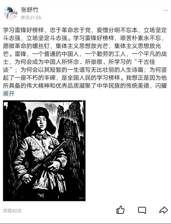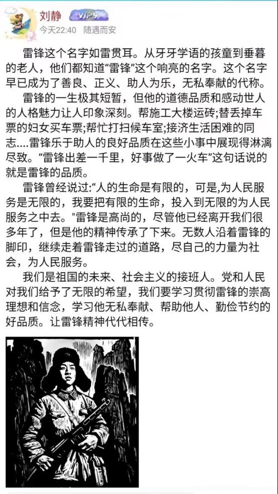 活动的前期,党支部各位部长和干事在党员群体中积极宣传雷锋事迹及精神,营造了良好的红色氛围。随后,各位党员就“学习雷锋好榜样”为主题写下了300字左右的感悟。并发布在QQ空间,朋友圈等社交平台,各位党员积极带头宣传雷锋精神,让红色的种子散布在每一个湖北文理学院学子的心中,滋养长大。星星之火,可以燎原。