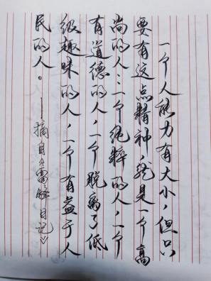 “人的生命是有限的,可是为人民服务是无限的,要把有限的生命投入到无限的为人民服务当中去。”雷锋精神是当下时代精神的主流之一, 我们学习雷锋全心全意为人民服务的“傻子”精神,干一行爱一行的螺丝钉精神,勤学苦练的钉子精神,应该以雷锋同志为终生奋斗的目标,把自己理想和国家梦想融入自身奋斗,把雷锋精神内化于心,外化于行,时刻践行雷锋精神,为实现中华民族伟大复兴而不断奋斗。