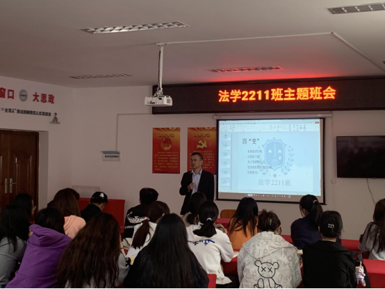 为帮助同学们进一步增进自我了解,做好人生规划,树立明确的奋斗目标,同时加强班级文化建设,营造团结友爱、积极进取的班级氛围,学工部部长兼法学2211班班主任周建修于2023年4月13日在慧园会议室与全班同学一起召开了线下主题教育班会。政法学院党委副书记汪萃萃、2022级辅导员邓仕元及法学2211班全体同学参加此次班会。