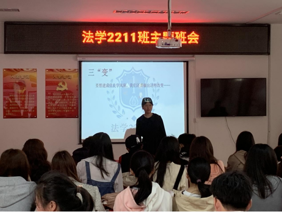 根据流程安排,班长首先点明了本次班会的主题——“变”,寓意着同学们自入学以来的各种变化。随后,由班主任周建修随机抽点同学们上台,分享自己从入学到现在的性格、个人能力以及对法学专业的看法等方面的变化。紧接着,上学期班级成绩排名第一的邱钢同学分享了自己的学习经验与方法,供同学们借鉴和参考。最后,同学们针对优秀班集体该如何打造的问题提出了自己的观点。