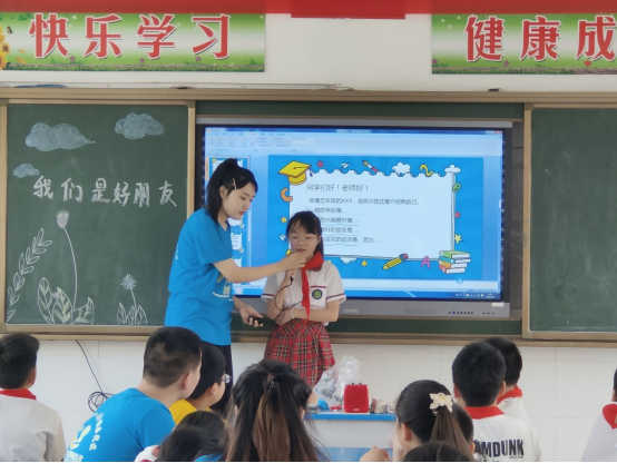第一节课为“我们是好朋友”。由团队成员孙聪聪引导学生相互认识,熟悉彼此。在志愿者的引导下,同学们轮番上台进行自我介绍,通过这一环节大家对新同学、新朋友有了更深入的认识和了解。在接下来的课堂教学环节中,团队志愿老师通过小组游戏“击鼓传花”让同学们上台分享自己心目中的好朋友,让同学们对友谊有了更深入的的思考和认识。