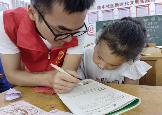 作业辅导环节,志愿者们首先询问小朋友们是否有明确任务,如果有,我们会记下来并我们会督促他们完成,如果没有,志愿者们会适量的为他们安排一些任务,在小朋友们写完后给他们检查。志愿者们按照小朋友们的年龄、性格进行分组,更有利于志愿者们系统化的管理和帮助,也可以让小朋友们之间互相讨论,加深对题目的理解,提高了志愿者辅导小朋友们写作业的效率 志愿队员们通过多种技巧和方法,循序渐进,帮助每位孩子弄清题意,了解题目所考察的知识点,并学以致用,学会以一举三。这种辅导方式使孩子们快速适应,也能高效率的学习到知识。