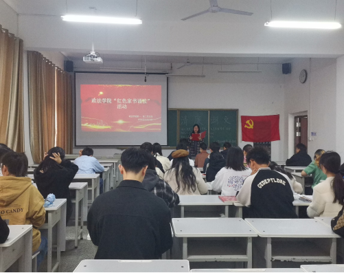 (政法学院 通讯员 刘俊)2023年10月12日中午12点10分,湖北文理学院政法学院开展“红色家书诵读活动”,此次活动是一次强化党史学习教育、提升党性修养、坚定理想信念的生动的教育课。号召党员同志们对党的忠诚扎根头脑、植入灵魂、变成信仰,努力争当有信仰、有担当、有气节、有情怀的党的好干部,切实把思想和行动统一到习近平新时代中国特色社会主义思想上来,用“家书”的怀情为建设经济发展、社会和谐、人民幸福的“清廉湖文”而努力奋斗!