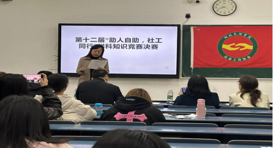 (政法学院 通讯员 刘晓玥)为增强学生对社会工作专业在实践中的理解,宣传社会工作专业理念,提升广大在校学生对社会工作专业的认识,社会工作协会于2023年11月23日下午6点在北区N8--C107教室举办第十二届“助人自助,社工同行”社工知识竞赛决赛。政法学院社会学系主任马国瑾、专业教师何晓红、刘英为、詹进伟、邵亚琪、王娟娟、李伟、朱丽君担任此次决赛评委。