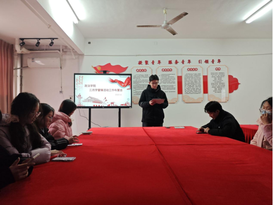 (政法学院 通讯员 程萧萧)为深入学习贯彻党的二十大精神,贯彻落实习近平总书记对深入开展学雷锋活动作出的重要指示精神,同时为了加强学生组织建设,提高活动质量,政法学院党团学社青各学生组织于3月4日中午12点30分在学院一站式学生社区召开学雷锋活动工作安排会议,出席本次会议的有团委书记何子涵及党团学社青各学生组织的主要学生干部。