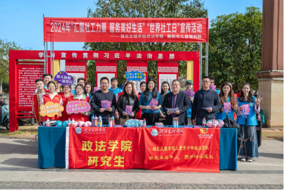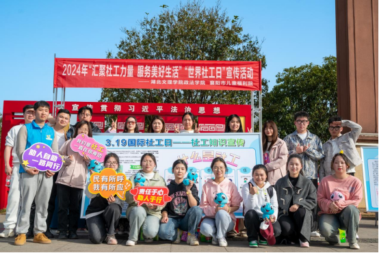 (政法学院 通讯员 刘静)3月19日下午3点,在襄阳市岘山广场,一场别开生面的主题活动正如火如荼进行。此次活动由湖北文理学院政法学院联合襄阳市儿童福利院共同举办,以志愿服务的形式,旨在通过普及“世界社工日”专业知识,增强社会对社工的尊重与认识,与雷锋月“志愿服务”精神相融合,深化对儿童权利的关注和保护,汇聚社工力量,共同服务美好生活。出席本次活动的有襄阳市民政局慈善社工科副科长胡博、市儿童福利院院长廖红娅、副院长刘敏、政法学院副院长王正宇教授、MSW中心负责人何晓红教授、社会工作专业教师李伟博士、董庚博士、辅导员李竹颖以及湖北文理学院政法学院学生志愿者和市儿童福利院职工、儿童共计80余人参加活动。