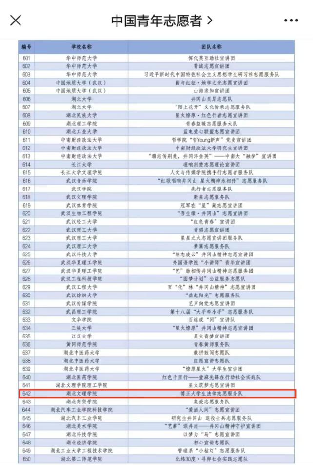 (政法学院 通讯员 文蝶)为深入学习宣传贯彻习近平新时代中国特色社会主义思想和党的二十大精神,落实“强国复兴有我”群众性主题宣传教育活 动相关要求,引导动员青年学生大力弘扬井冈山精神,团中央青 年志愿者行动指导中心、全国青少年井冈山革命传统教育基地管 理中心、井冈山管理局联合开展井冈山精神志愿宣讲活动,面向全国高校遴选1000支大学生志愿宣讲团。4月3日,中国青年志愿者公众号公布2024年全国大学生井冈山精神志愿宣讲团入选名单,湖北文理学院博正大学生法律志愿服务队成功入选!