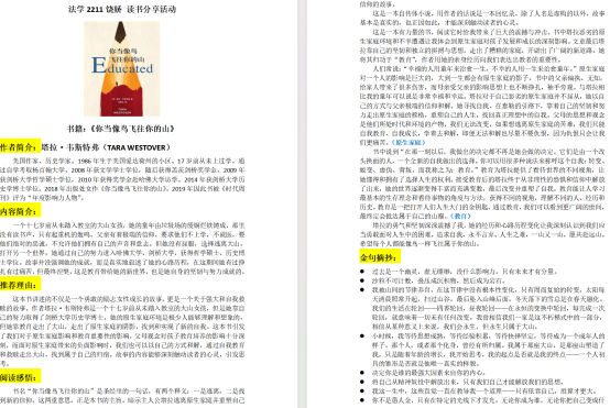 此次活动以线上形式进行,征稿要求为图文结合,通过活动群聊具体开展工作。韩梦蝶同学从写作背景、理论视角、全书结构和研究结论等角度分析《乡土中国》,结合社工专业知识分享自己的心得体会。韩伊文同学以书信的形式讲述自己被《人生海海》触动的心灵。余自坤同学则在阅读中对“罪与刑”有了更深的思考,同时发现还有更多的命题需要发掘、扩充。参与活动的同学们从不同的角度畅谈自己的所思所想、所感所悟,在交流分享中体验阅读的无尽乐趣,培养读书兴趣。