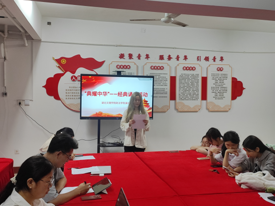 (政法学院 通讯员 胡熠暄)为贯彻落实党的二十大精神,激励更多学生参与阅读,引领广大青年走进中华经典,传承发展中华优秀语言文化,政法学院演讲协会于4月22日在一站式社区举办了“典耀中华”经典诵读比赛。参加本次比赛的有政法学院团委书记何子涵及活动参与者二十五人。