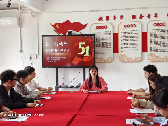 (政法学院 通讯员 张启慧)随着五一假期的临近,为切实增强学生的安全防范意识,提升学生的自我保护能力,引导学生树立安全意识,4月28日,政法学院组织MSW专业23级全体研究生开展了五一假期安全教育主题班会。此次班会由辅导员李竹颖主持,旨在通过教育和引导,让同学们在享受假期的同时,牢记安全至上原则,确保大家度过一个平安、愉快的假期。