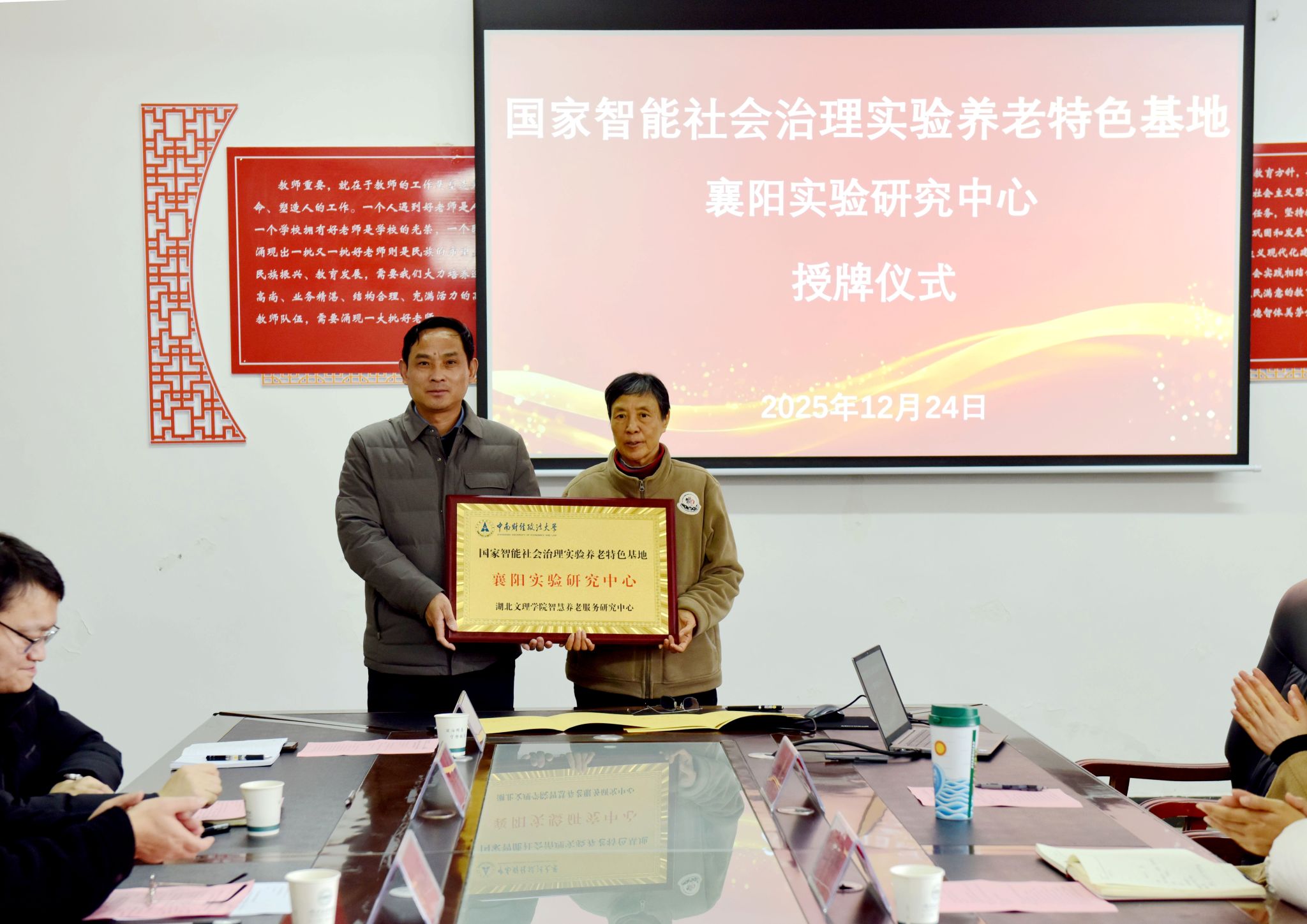 政法学院 通讯员 刘金华 王珊)12月24日,中南财经政法大学国家智能社会治理实验养老特色基地襄阳实验研究中心在学校揭牌。中南财经政法大学养老特色基地主任赵曼教授,学校副校长汪云教授出席揭牌仪式。